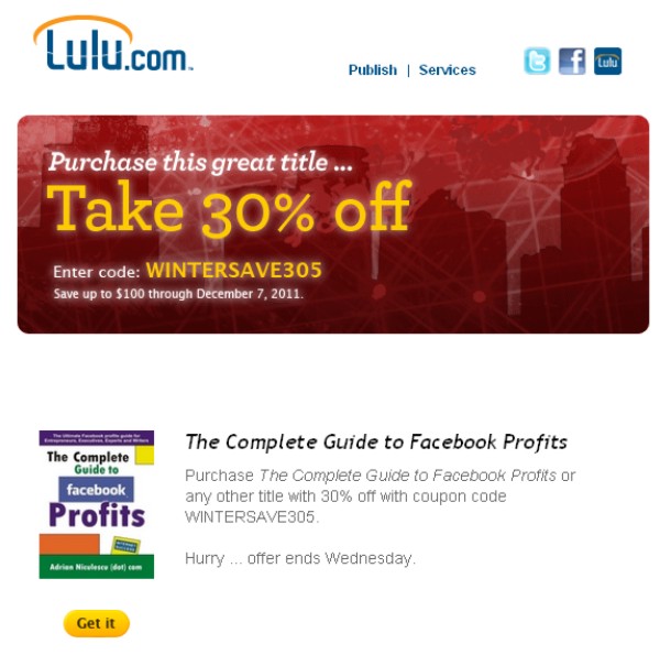 The Complete Guide To Facebook Profits was just featured on lulu.com’s newsletter. It is one of my ebooks about social media marketing and Facebook monetisation mostly and is offered at 30% off.